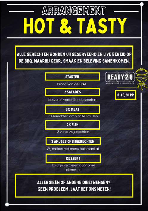 Maak van jouw evenement een onvergetelijke smaakbeleving met de Hot & Tasty BBQ van Ready2Q. Dit pakket is inclusief stretchtent van 7.5m x 10m.